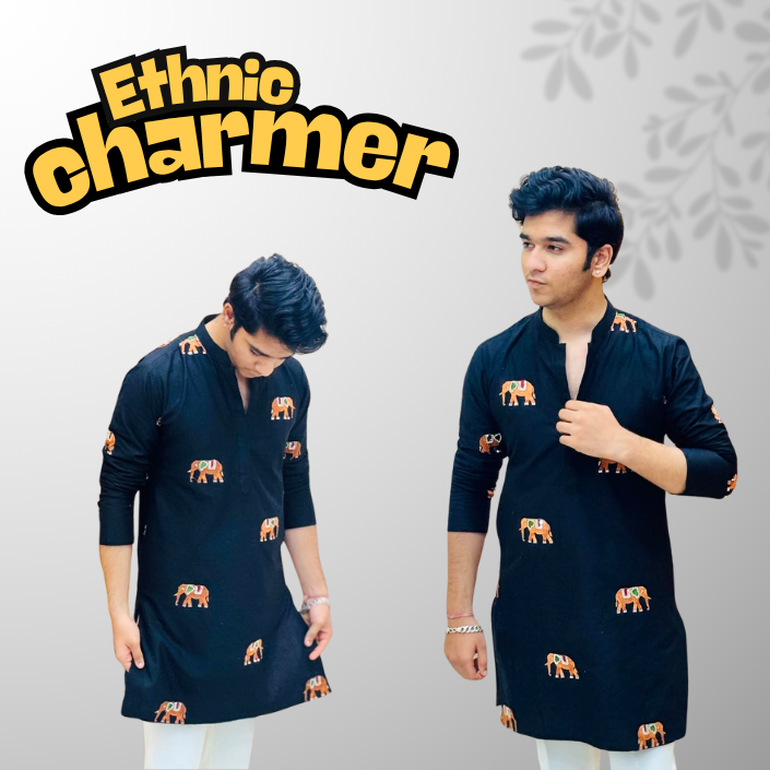 Blue Charcoal ELEPHANT Embroidered Work Men's Kurta with Pajama