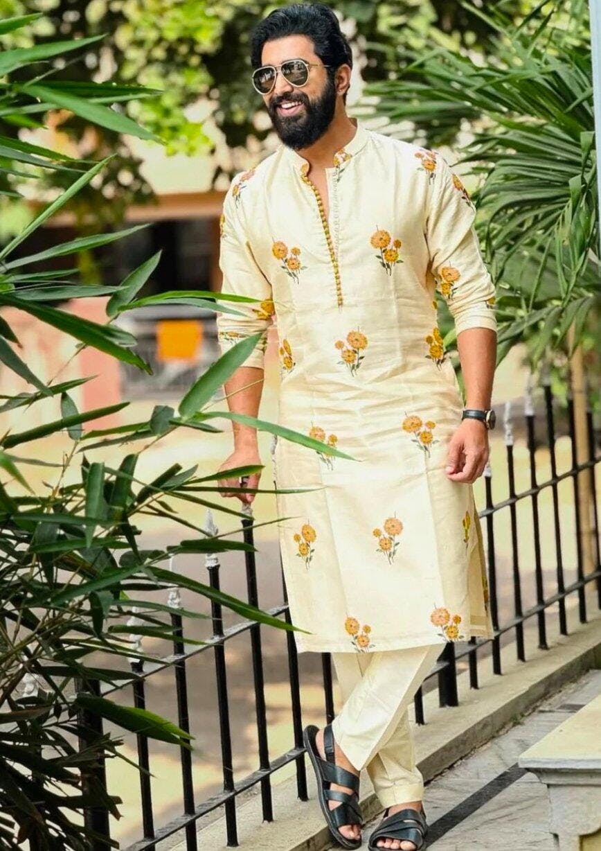 YELLOW CHANDERI PRINTED KURTA PAJAMA SET FOR MEN'S